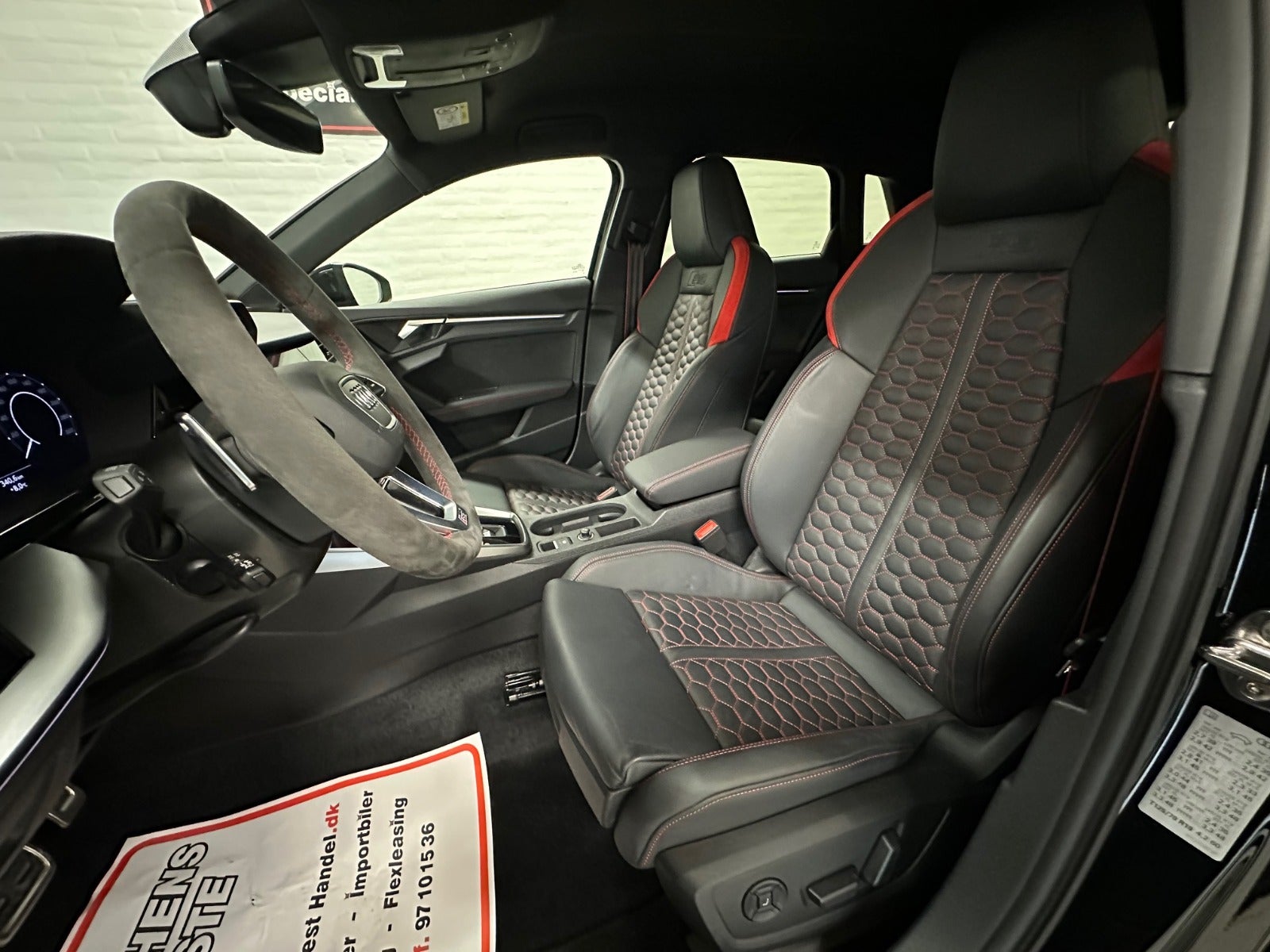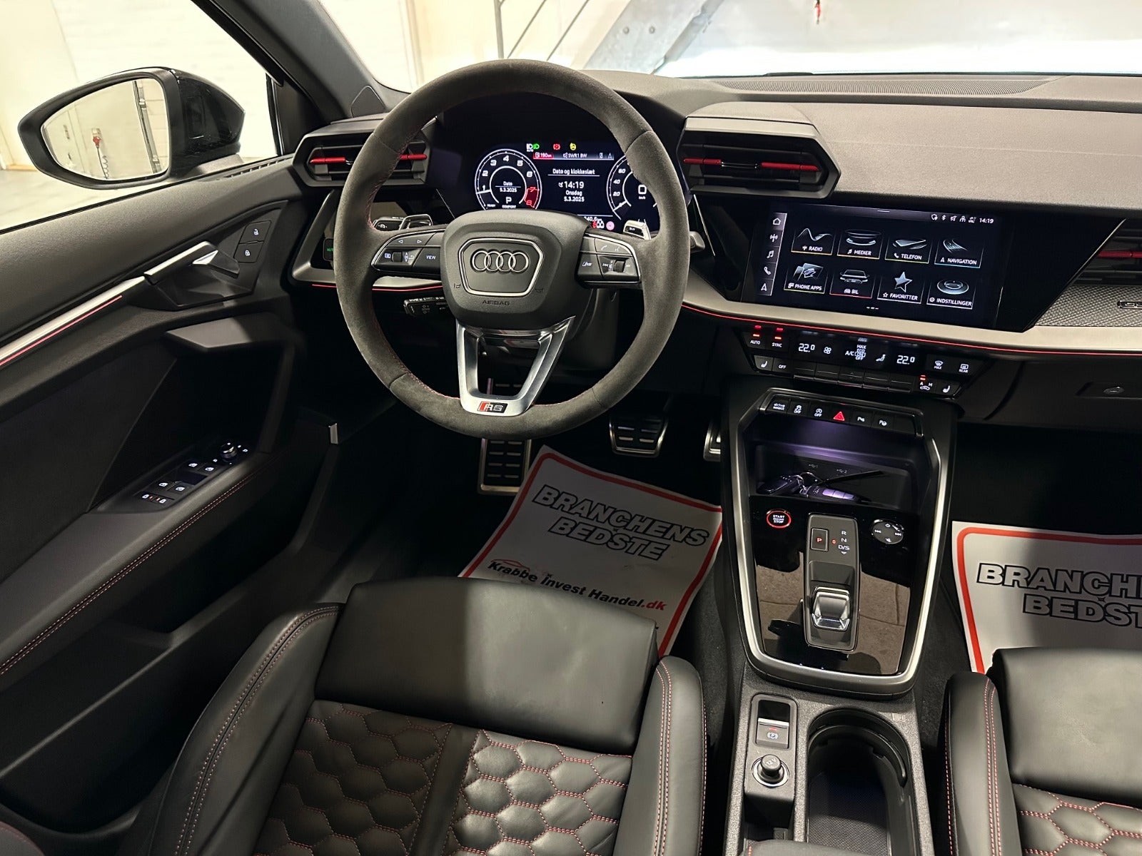 adaptiv fartpilot, keramiske bremser, b&o lydsystem, RS-sportsudstødning, RS-sportssæder, RS-dynamikpakke plus, RS-designpakke, hævet topfart, matrix led forlygter, fjernlysassistent, ambiente belysning, el komfortsæder, massage i forsæder, el indst. forsæder, carbon pakke, sort optik, bakkamera, digitalt cockpit, navigation MMI plus, nøglefri adgang, nøglefri tænding, adaptiv undervogn, 3 zone klima, automatisk parkeringssystem, skiltegenkendelse, vognbaneassistent, blindvinkelsassistent, 19″ alufælge,