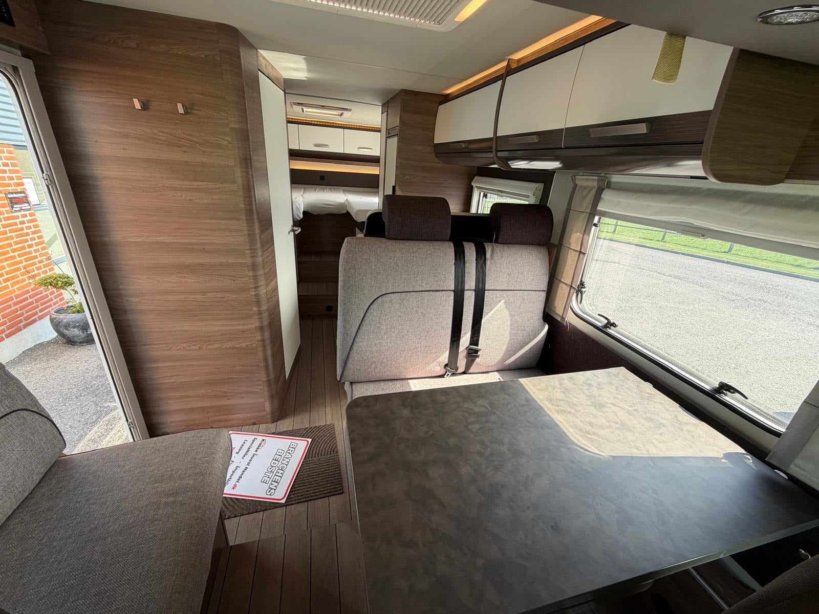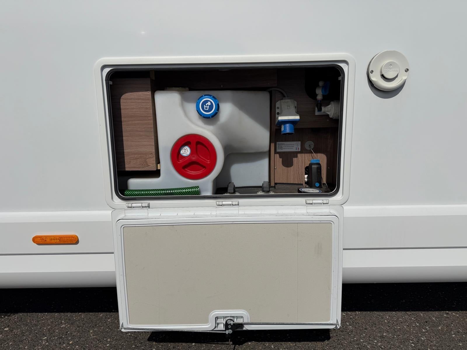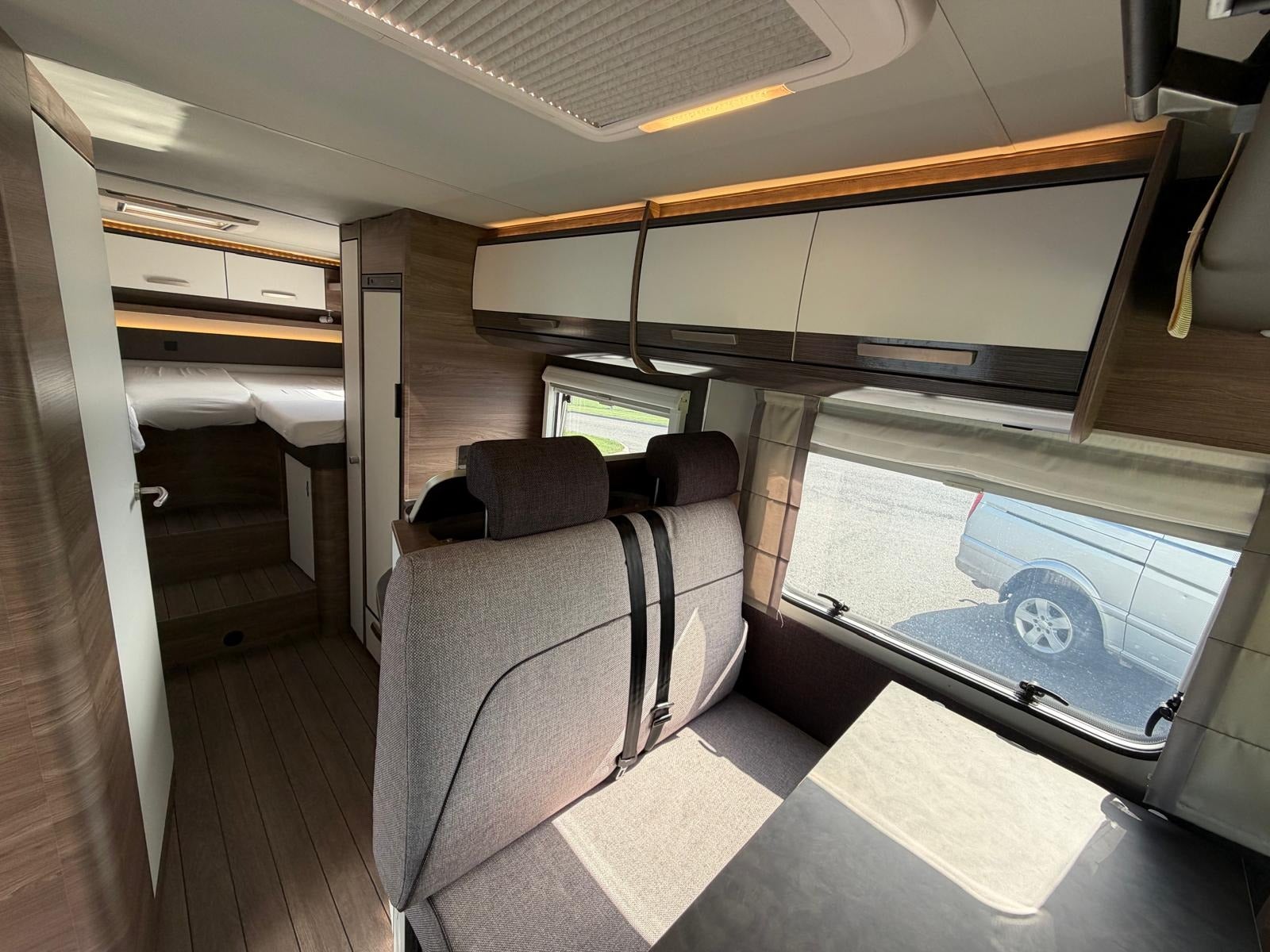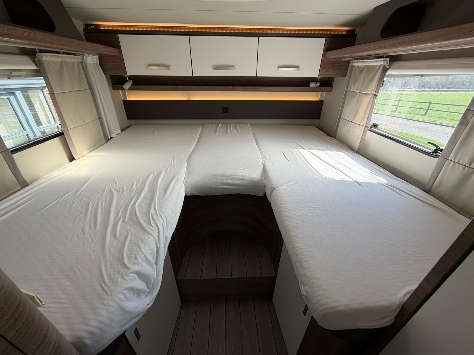 Det, der virkelig gør denne vogn unik, er den gennemtænkte indretning med to komfortable senge i midten og stort badeværelse med separat toilet og bruser bagerst. Her slipper du for at kravle op i en seng – og får i stedet en rummelig og komfortabel løsning med masser af plads i hele vognen.