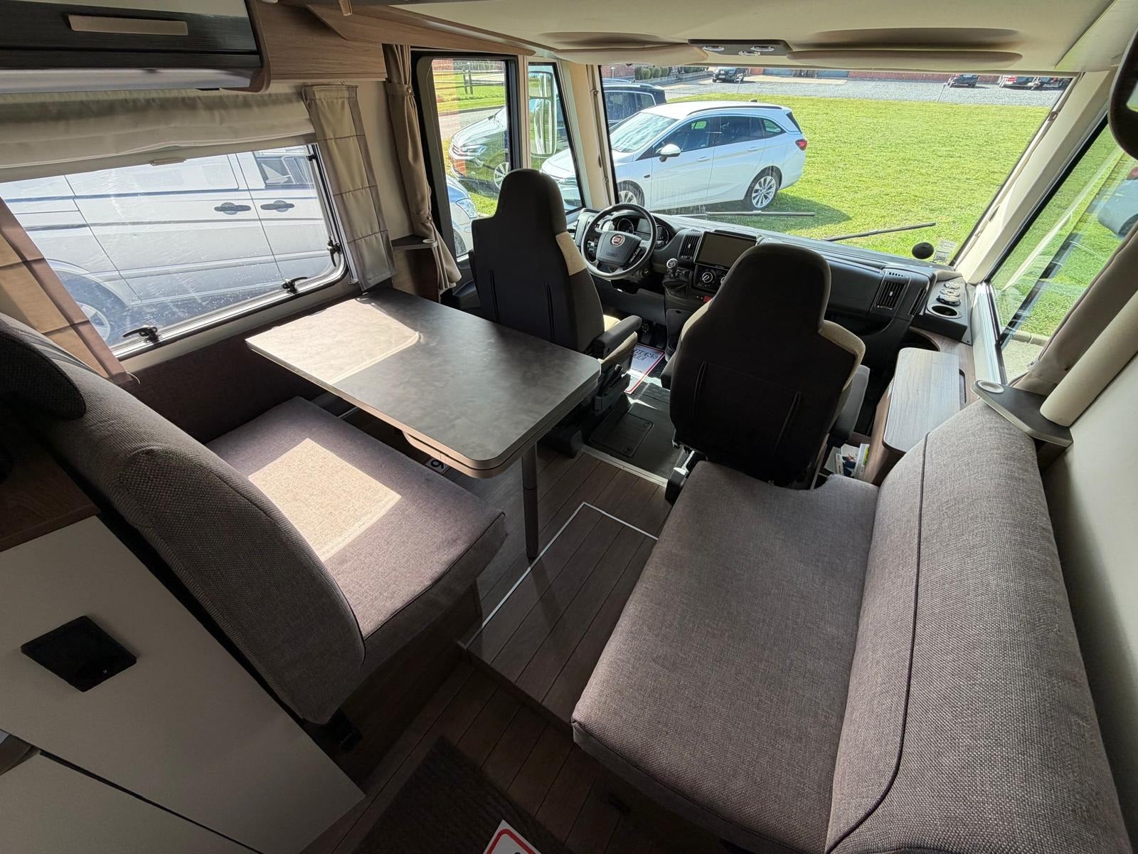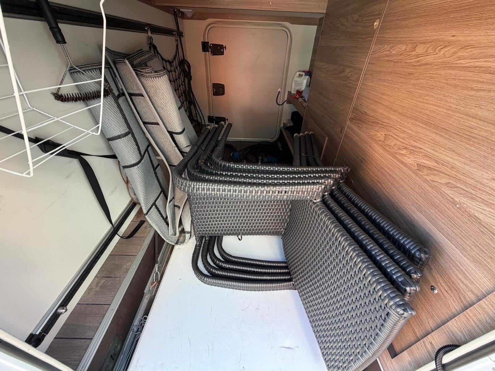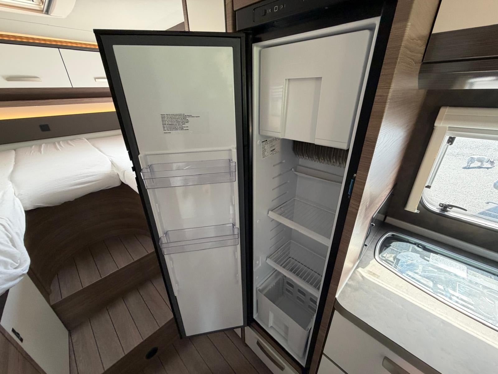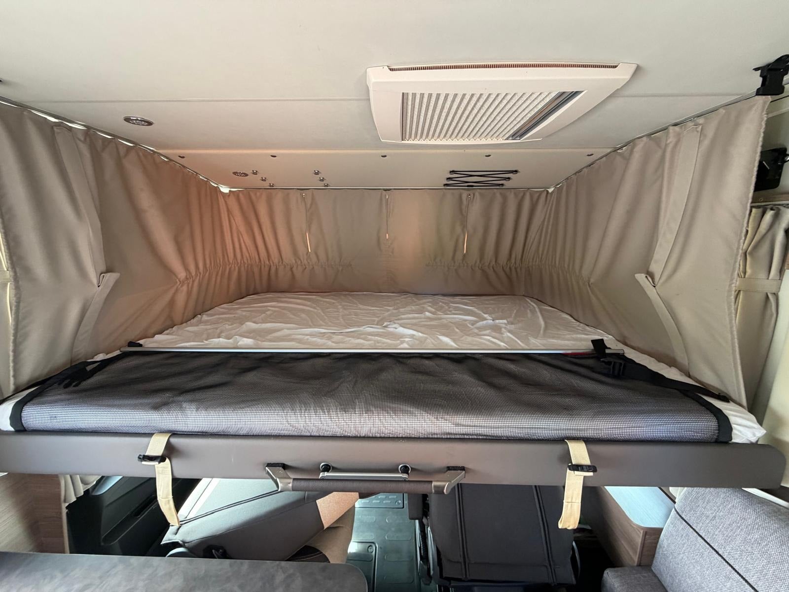Det, der virkelig gør denne vogn unik, er den gennemtænkte indretning med to komfortable senge i midten og stort badeværelse med separat toilet og bruser bagerst. Her slipper du for at kravle op i en seng – og får i stedet en rummelig og komfortabel løsning med masser af plads i hele vognen.