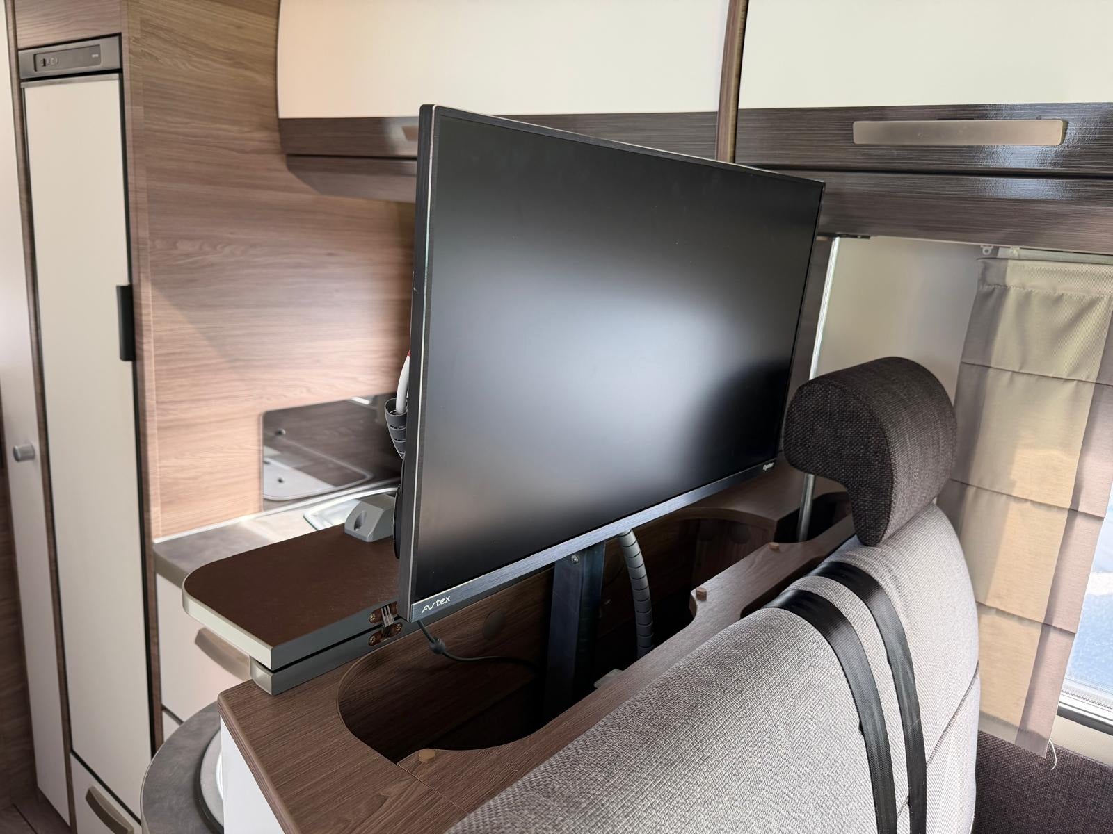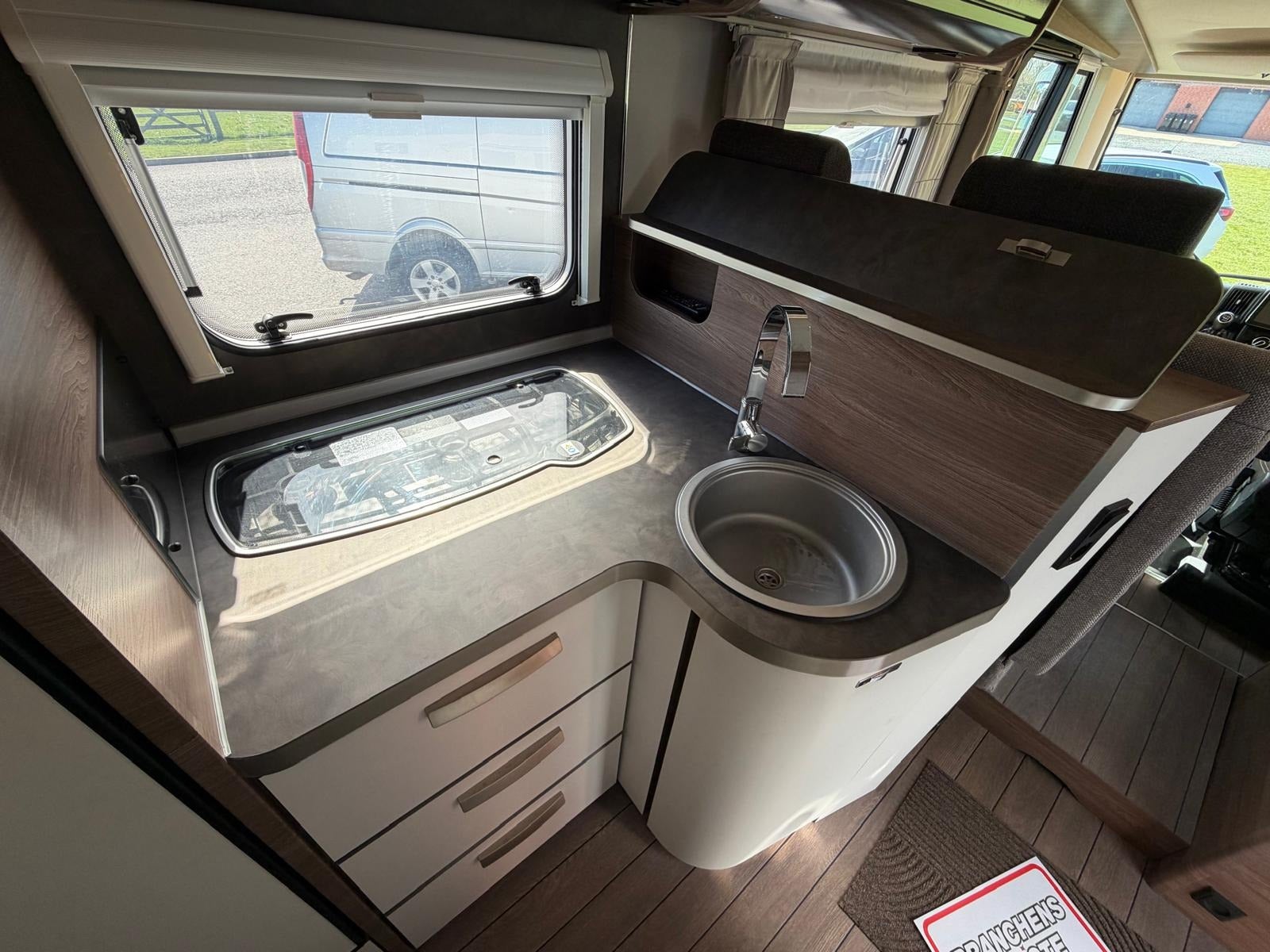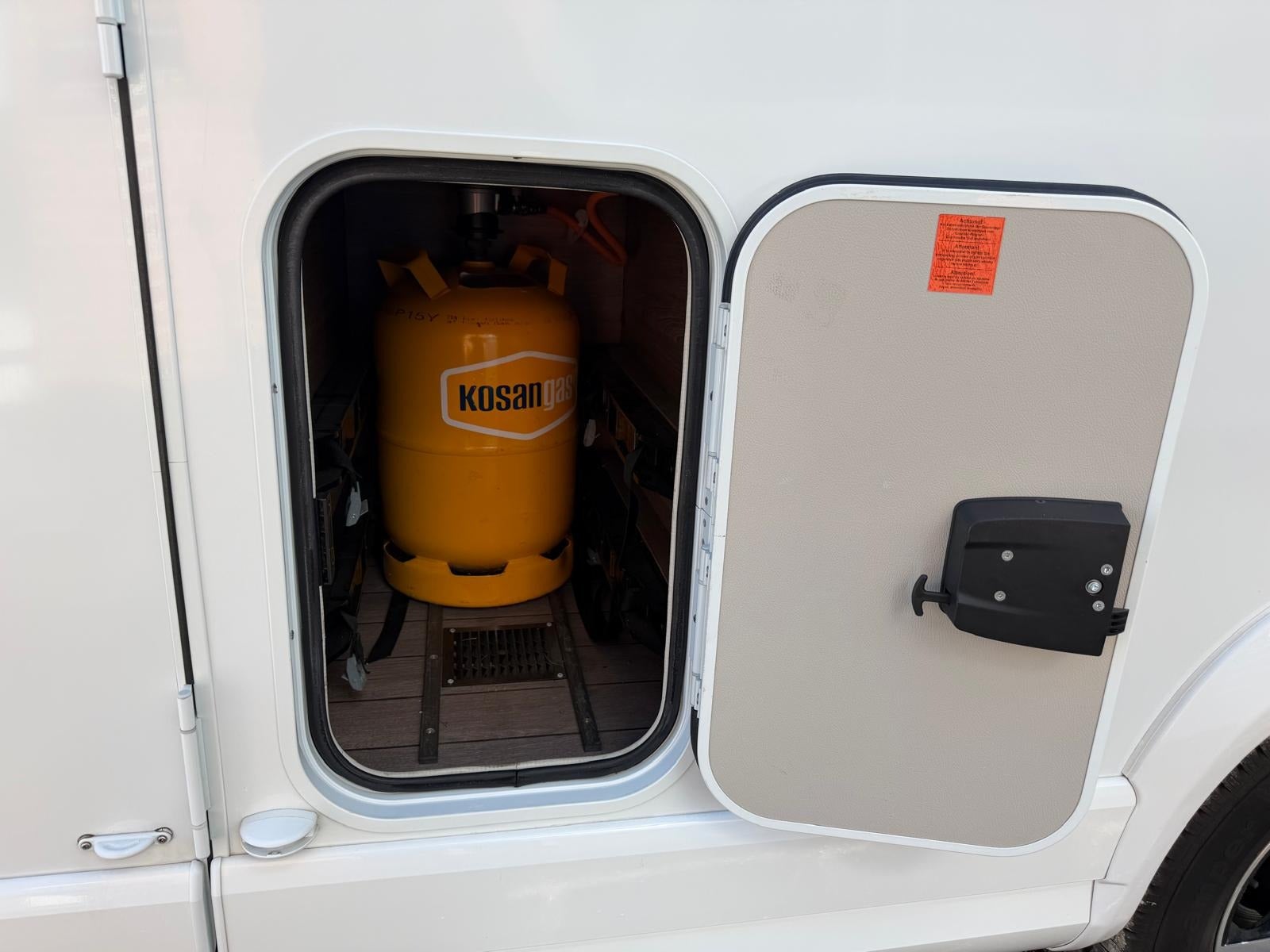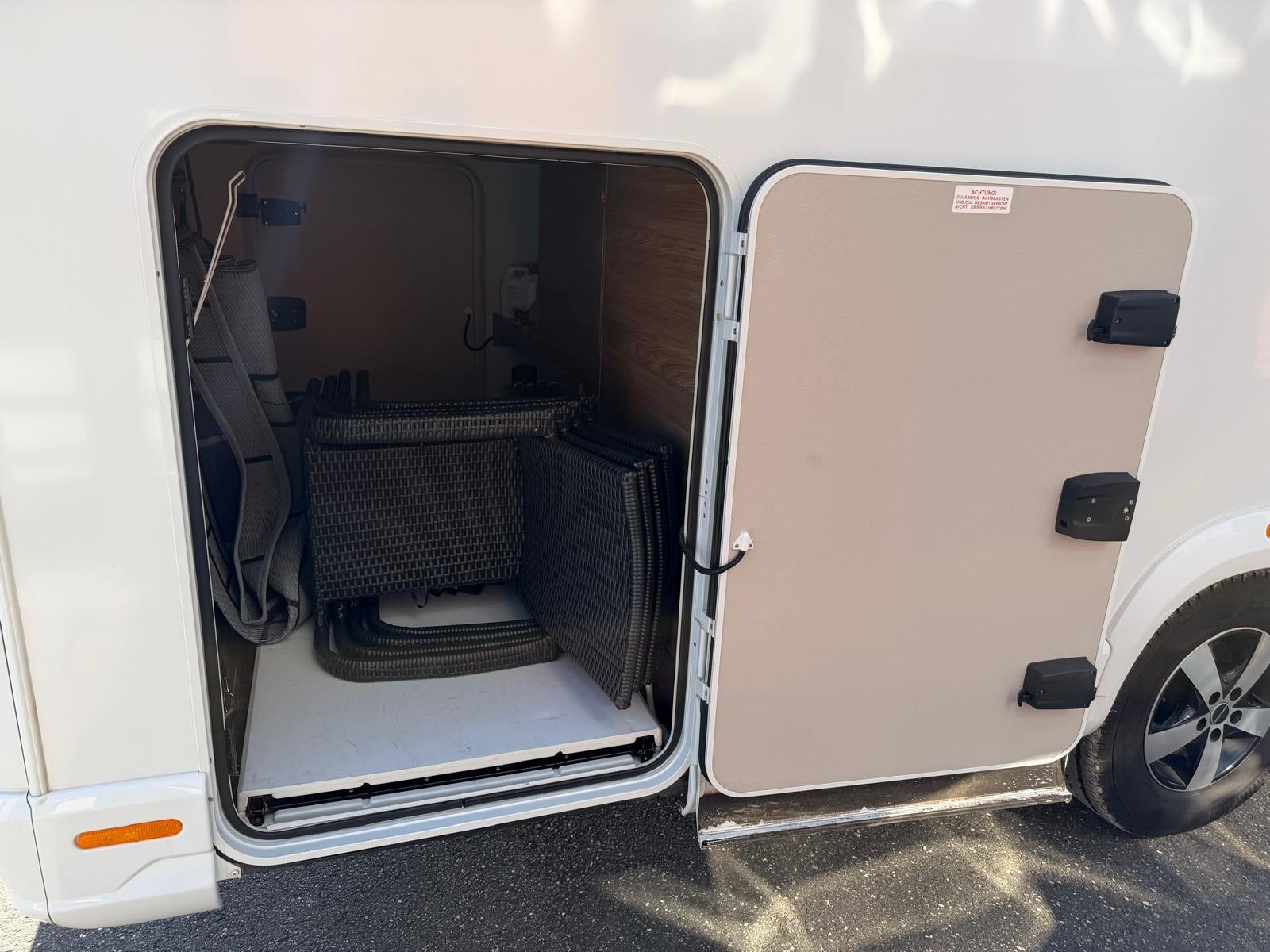 Det, der virkelig gør denne vogn unik, er den gennemtænkte indretning med to komfortable senge i midten og stort badeværelse med separat toilet og bruser bagerst. Her slipper du for at kravle op i en seng – og får i stedet en rummelig og komfortabel løsning med masser af plads i hele vognen.