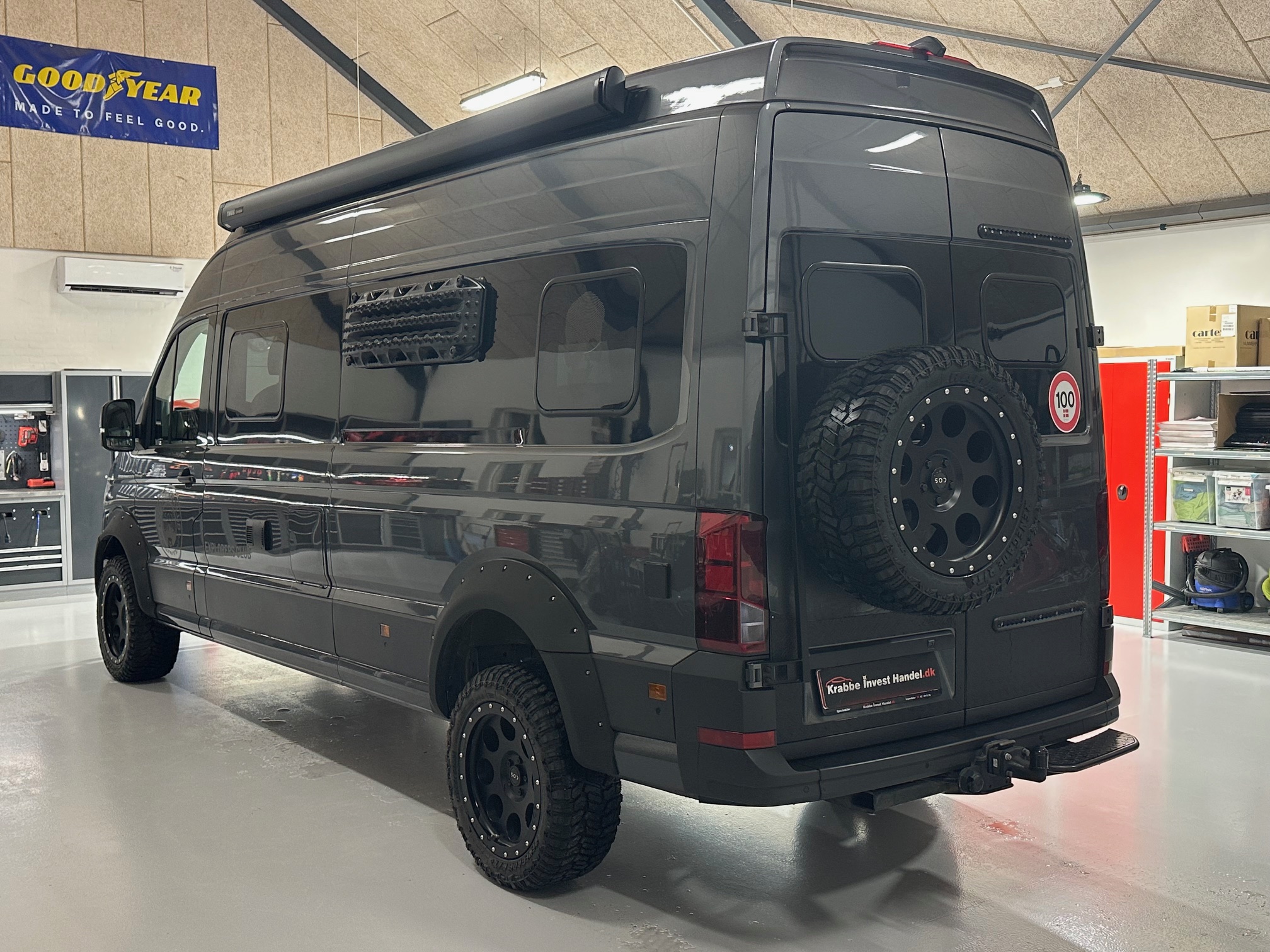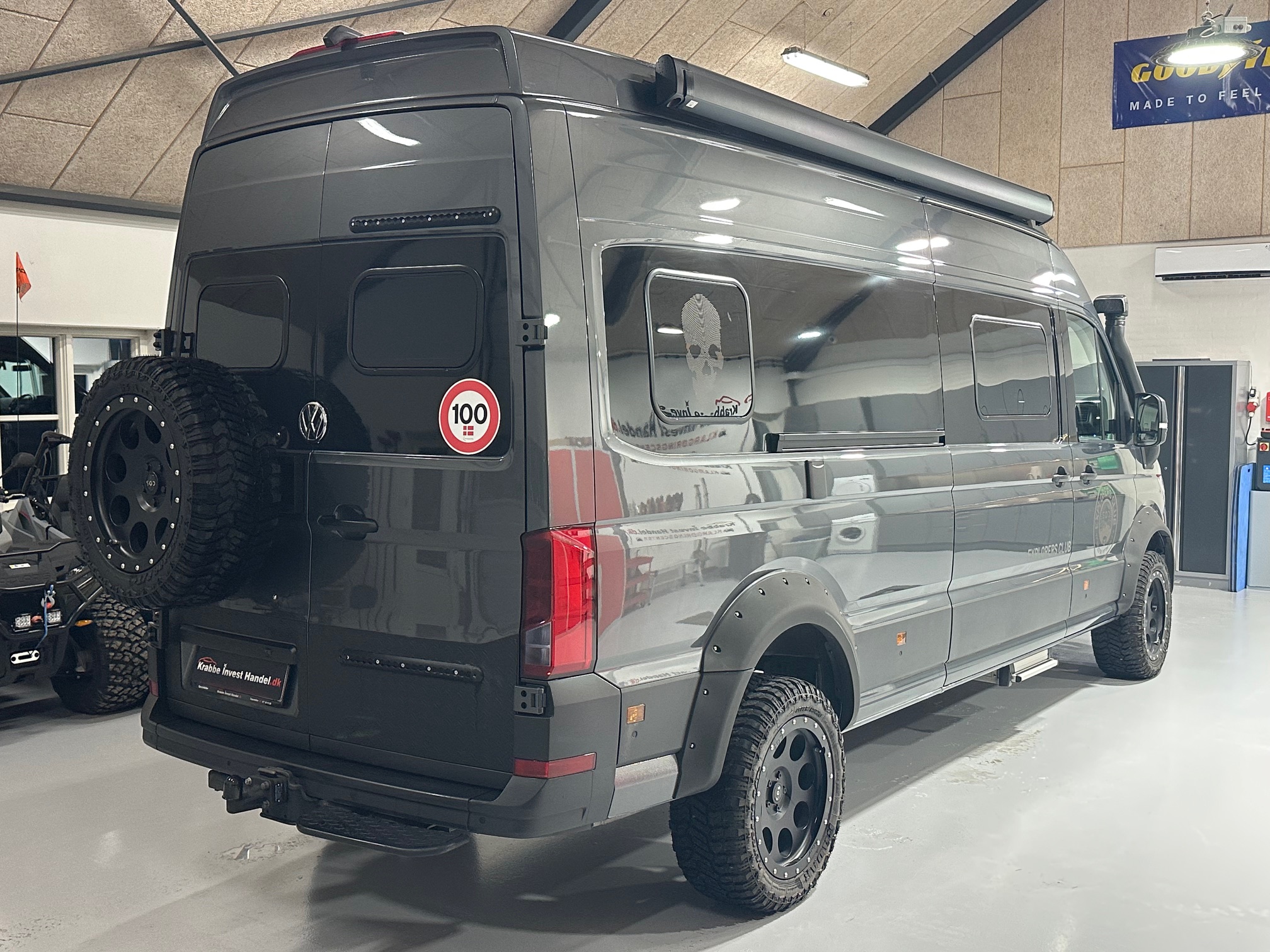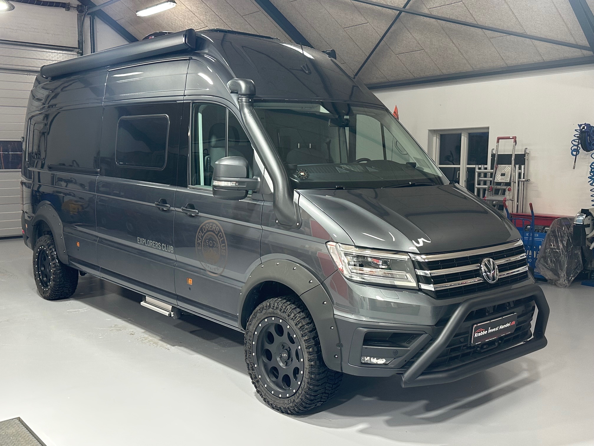 SOD opbygning, adaptiv fartpilot, hævet undervogn, terræn hjul, fuld led forlygter, sandboards, reservehjul, anhængertræk, trinbræt, markise, snorkel, oliefyr, seng, toilet, køkken